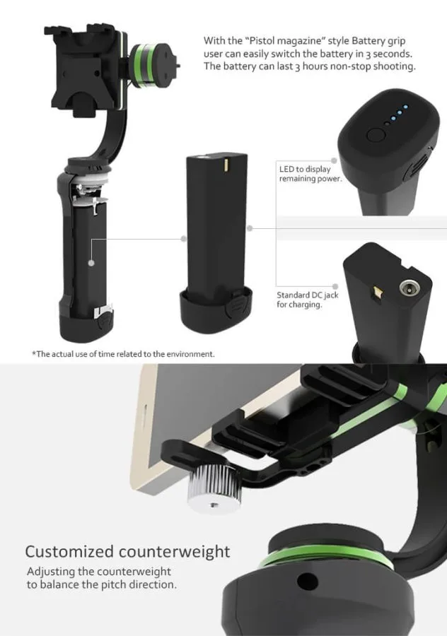 Baterie se také liší od výše popsaného kardanového závěsu. I když je také zaměnitelný s kardanem HHG-01, má design podobný časopisu, a proto se musíte spolehnout na speciální baterii výrobce. Aktivní doba běhu tohoto kardanového kloubu je 3 hodiny.