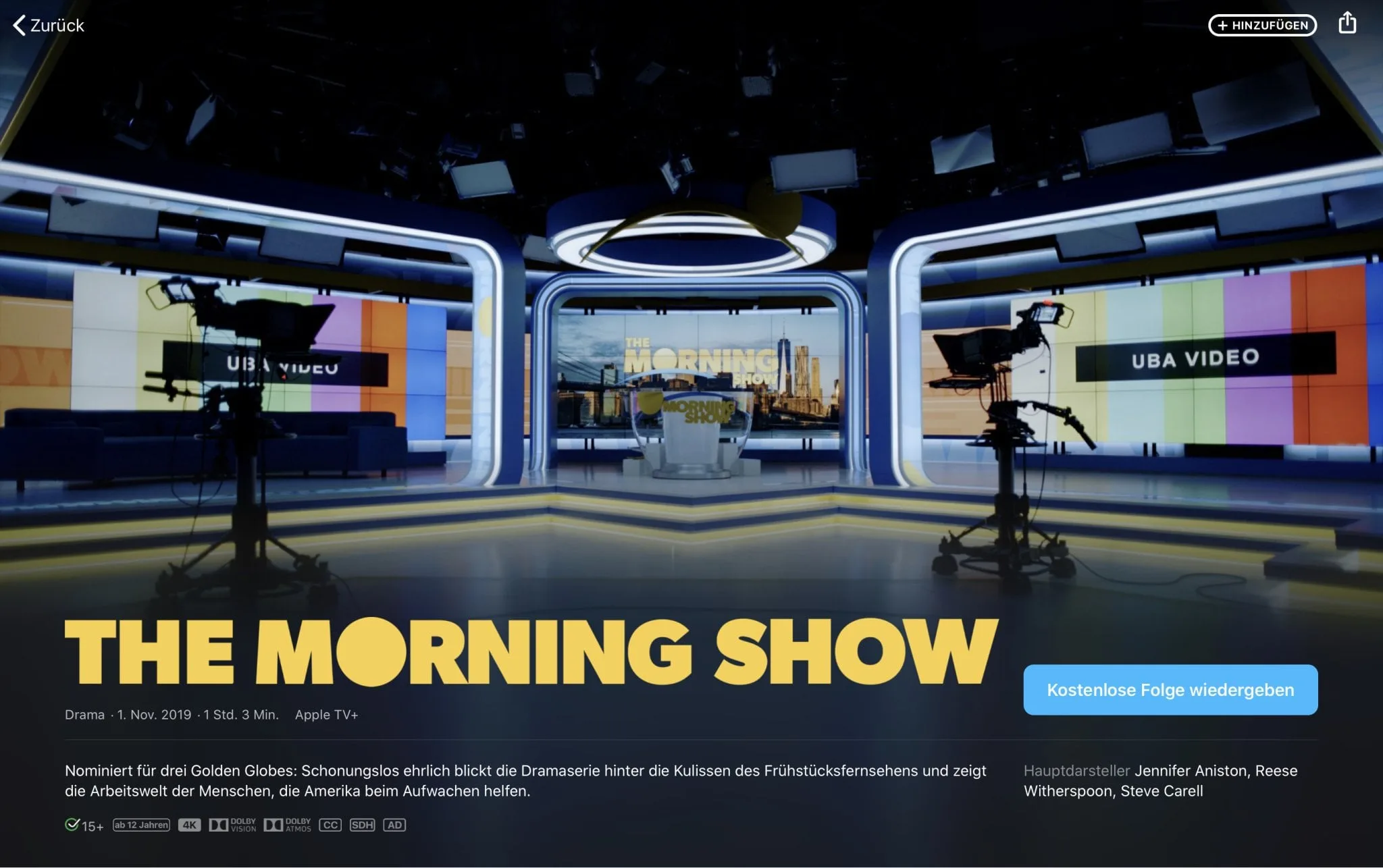 Apple stručně popisuje svou novou řadu jako „For All Mankind“, „See“ nebo „Servant“, která byla zveřejněna v roce 2019 s novým předplatným za 4,99 EUR měsíčně. Apple také uvádí, že TV + je první streamingová platforma, která byla během svého uvedení na trh několikrát nominována na Zlatý glóbus a Screen Actors Guild.